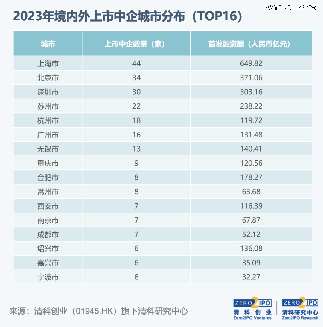 從城市排名來(lái)看,滬、京、深、蘇、杭包攬IPO數(shù)量前五席位,共計(jì)148家,合計(jì)占比37.1%。其中,蘇州市上市企業(yè)主要分布在半導(dǎo)體行業(yè),而杭州則以生物醫(yī)療和機(jī)械制造行業(yè)為主。