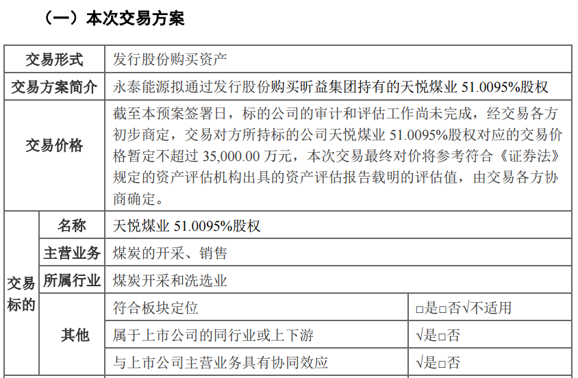 永泰能源公告稱,公司擬通過發(fā)行股份方式,購買山西昕益能源集團(tuán)有限公司所持天悅煤業(yè)51.0095%的股權(quán)。本次交易價格暫定不超過3.5億元,最終交易對價將參考資產(chǎn)評估報告載明的評估值,由交易各方協(xié)商確定。