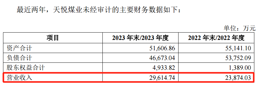 同時,天悅煤業(yè)未經(jīng)審計的主要財務(wù)數(shù)據(jù)中,2022年、2023年的營業(yè)收入分別為2.39億元、2.96億元。