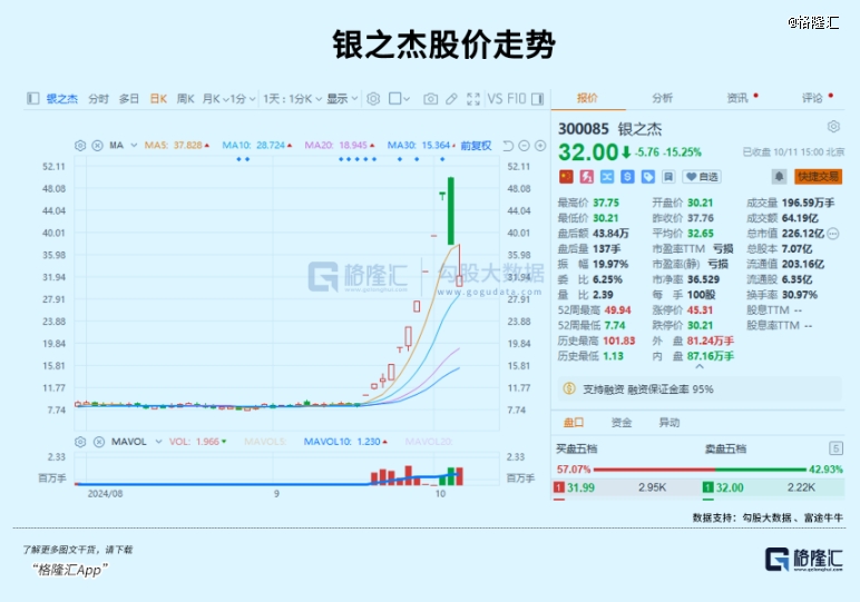 8月28日,金融科技還在近6年新低的狀態(tài),但到了10月9日就已累計(jì)反彈超94%。其中的成份股近10日就有7只股票股價(jià)翻倍,指南針、同花順、東方財(cái)富等都漲超了70%。10天9板暴力拉升的銀之杰從9月中旬的低點(diǎn)到近日股價(jià)高點(diǎn)甚至飆漲了近5倍。