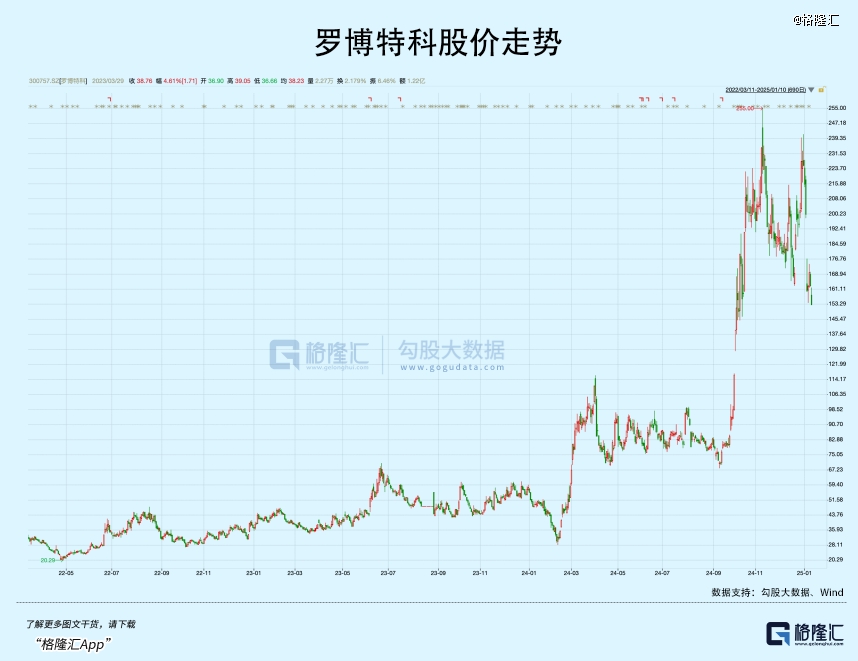 近幾年,羅博特科是A股少有的大牛股,股價(jià)從2022年4月的*20.1元,一路飆到2024年11月的最高255元,暴漲近12倍。