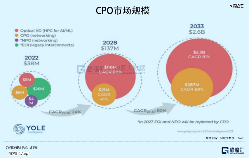 Yole報(bào)告數(shù)據(jù)顯示,2022年CPO市場(chǎng)產(chǎn)生的收入預(yù)計(jì)2033年將達(dá)到26億美元,2022-2033年復(fù)合年增長(zhǎng)率為46%。