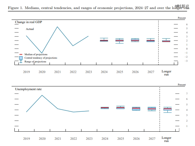 與會(huì)者們將2024年美國(guó)GDP增長(zhǎng)預(yù)期從2.1%下調(diào)至2%,并預(yù)計(jì)未來(lái)三年的增長(zhǎng)都將保持在這一數(shù)字,長(zhǎng)期增速保持在1.8%不變;今年的失業(yè)率預(yù)期從4%上調(diào)至4.4%,未來(lái)三年分別為4.4%、4.3%和4.2%。