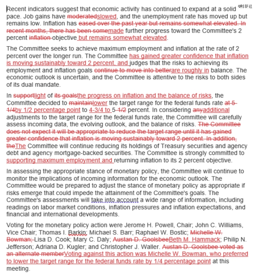 根據(jù)與上一次決議聲明進(jìn)行的比對(duì),F(xiàn)OMC將就業(yè)“穩(wěn)定”改為“放緩”;修改了對(duì)于通脹的描述;“進(jìn)入到更好的風(fēng)險(xiǎn)平衡”改為“大致平衡”;刪除了“在對(duì)通脹持續(xù)向2%邁進(jìn)更有信心之前,不宜降低利率目標(biāo)區(qū)間”的措辭。
