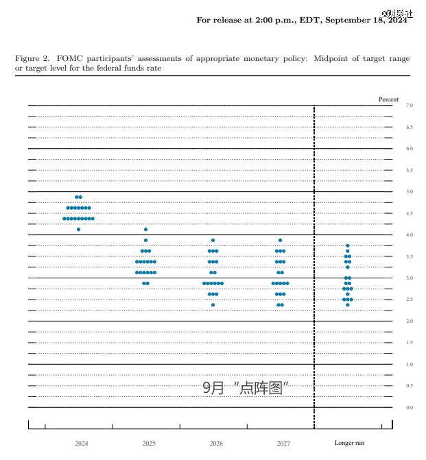 備受關(guān)注的利率預(yù)測(cè)“點(diǎn)陣圖”顯示,19位政策制定者對(duì)2024年末美聯(lián)儲(chǔ)利率預(yù)期的中位數(shù)落在4.25%至4.5%之間。這意味著,他們整體認(rèn)為到年底還會(huì)再當(dāng)前的基礎(chǔ)上再累計(jì)降息50個(gè)基點(diǎn)