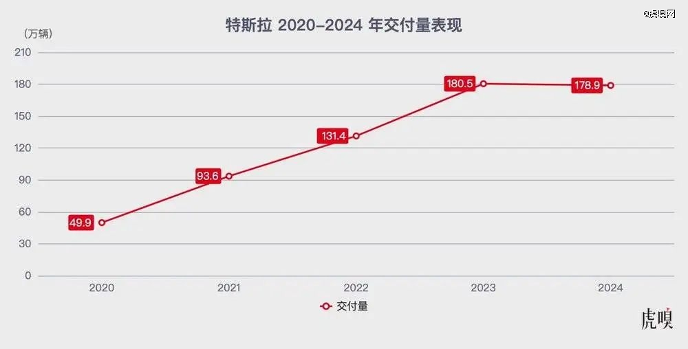特斯拉近五年交付量表現(xiàn),2024 年出現(xiàn)了下滑