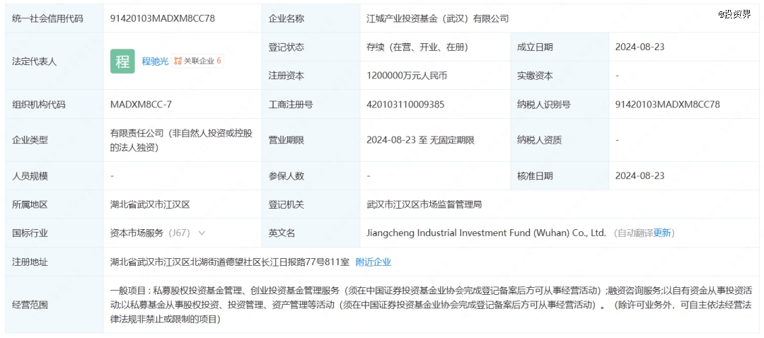 投資界-解碼LP獲悉,武漢投資平臺——江城產(chǎn)業(yè)投資基金(武漢)有限公司成立,注冊資本120億人民幣,由武漢金融控股(集團)有限公司(簡稱“金控集團”)全資持股,后者由武漢市國資委實際控制。