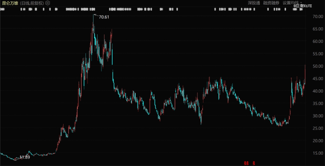 同樣在2023年大幅受益于AI概念的昆侖萬(wàn)維,盡管當(dāng)時(shí)并無(wú)特別亮眼的AI應(yīng)用落地,股價(jià)卻也在5月5日上漲到了歷史性高位70.61元/股。
