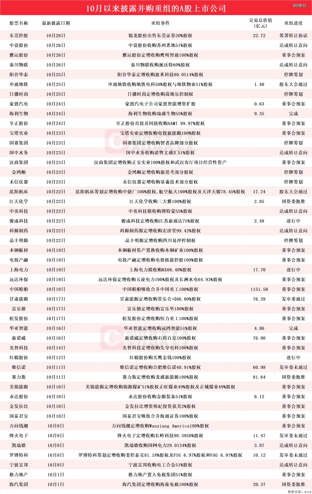 據(jù)Wind數(shù)據(jù)統(tǒng)計,剔除重組失敗、出讓方、ST股,10月以來披露并購重組進展的A股上市公司共有47家,分別為東莞控股、中設(shè)股份、雅運股份、秦川物聯(lián)、陽谷華泰、申通地鐵、日播時尚、豪恩汽電、海利生物、至正股份、寶塔實業(yè)、因賽集團、國中水務(wù)、漢商集團、金鴻順、禾信儀器、沈陽機床、江天化學(xué)、中英科技、駿成科技、科源制藥、晶豐明源、本鋼板材、電投產(chǎn)融、上海電力、遠達環(huán)保、中國船舶、甘肅能源、富樂德、松發(fā)股份、華亞智能、新諾威、光智科技、紅棉股份、維信諾、賽力斯、美錦能源、永達股份、金發(fā)拉比、國泰君安、萬向錢潮、烽火電子、凱瑞德、羅博特科、寧波富邦、格力地產(chǎn)和海汽集團。具體情況如下圖: