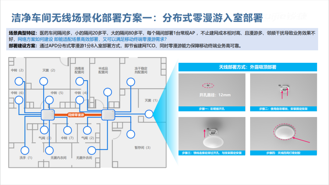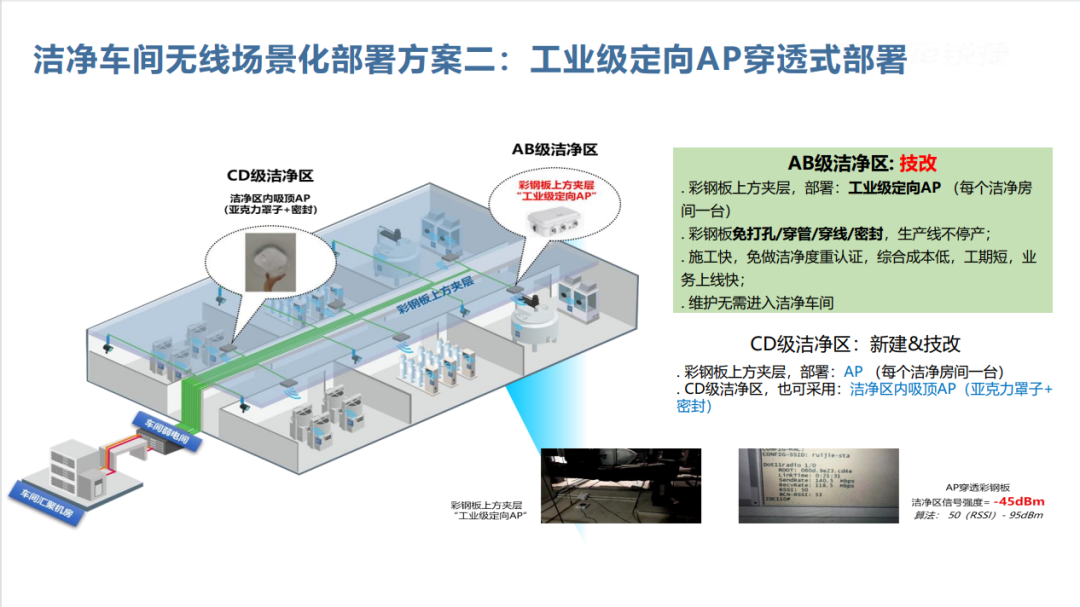 潔凈車間環(huán)境要求極高,普通無線設(shè)備難以適配。銳捷網(wǎng)絡(luò)潔凈車間方案在車間外部署分布式零漫游 AP,利用饋線將信號引入車間內(nèi)部。某知名藥企采用該方案后,成功解決傳統(tǒng) AP 部署設(shè)備多、成本高且不合規(guī)的問題,保障了車間內(nèi)設(shè)備無線傳輸穩(wěn)定,確保數(shù)據(jù)采集和指令傳輸順暢。