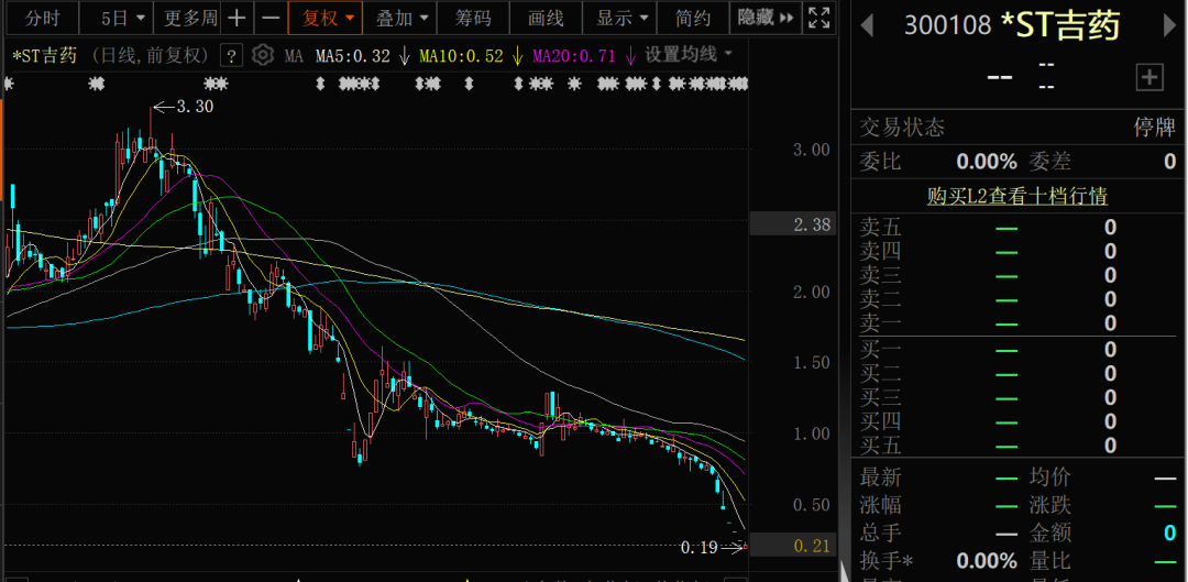 截至停牌前,*ST吉藥股價報收于0.21元/股,總市值為1.4億元。