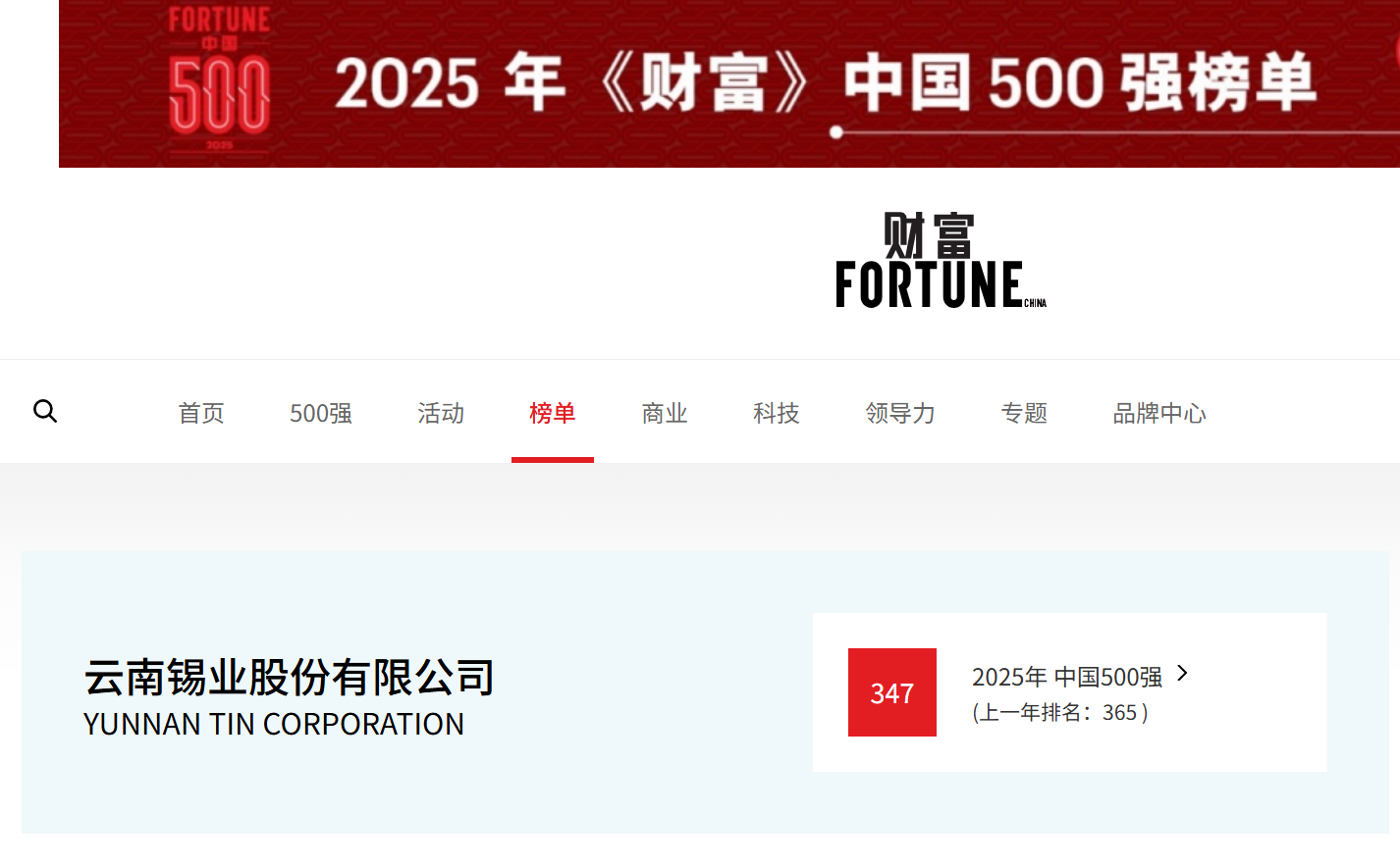 7月22日,2025年《財富》中國500強排行榜發(fā)布,錫業(yè)股份(000960)位居第347位,較去年排名上升18位。