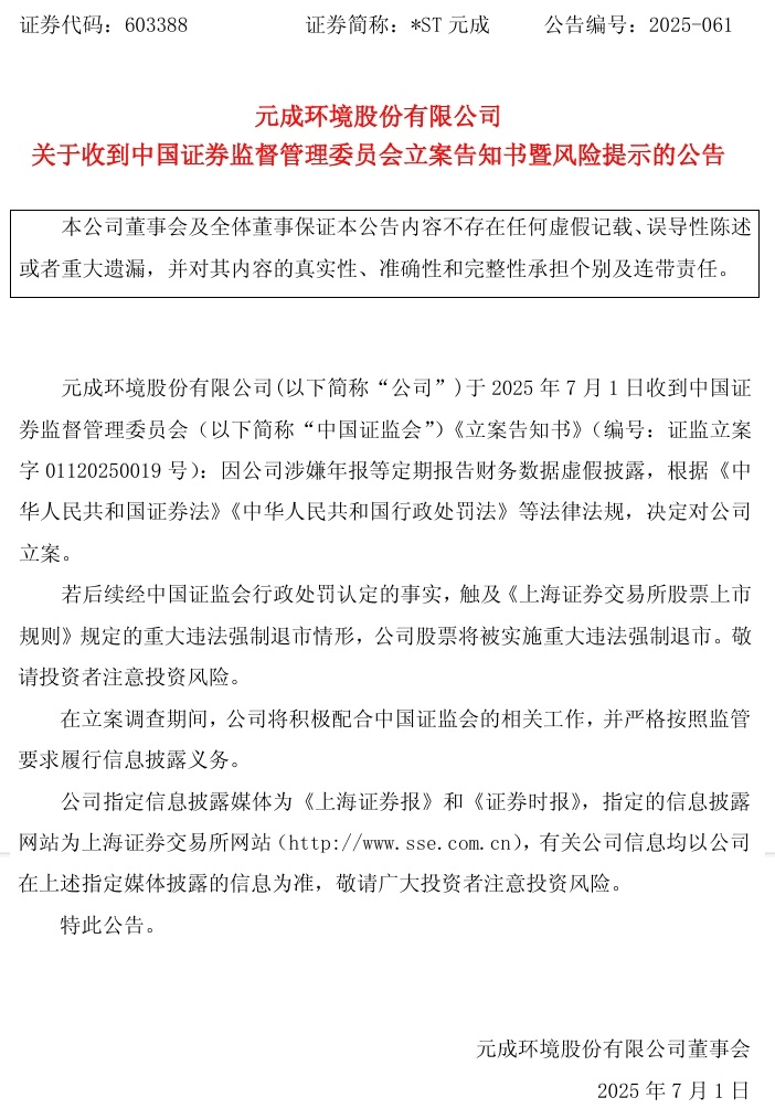 此次公司股價遭遇9連跌,主要源于2025年7月2日公司因涉嫌年報等定期報告財務(wù)數(shù)據(jù)虛假披露,被中國證監(jiān)會立案。若后續(xù)經(jīng)中國證監(jiān)會行政處罰認定的事實,觸及《上海證券交易所股票上市規(guī)則》規(guī)定的重大違法強制退市情形,公司股票將被實施重大違法強制退市。