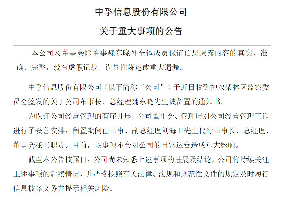 7月23日晚,中孚信息(300659)(300659.SZ)發(fā)布《關(guān)于重大事項(xiàng)的公告》。公司于近日收到神農(nóng)架林區(qū)監(jiān)察委員會簽發(fā)的關(guān)于公司董事長、總經(jīng)理魏東曉被留置的通知書。為保證公司經(jīng)營管理的有序開展,公司董事會、管理層對公司經(jīng)營管理工作進(jìn)行了妥善安排,留置期間由董事、副總經(jīng)理劉海衛(wèi)代行董事長、總經(jīng)理、董事會秘書職責(zé)。目前,該事項(xiàng)不會對公司的日常運(yùn)營造成重大影響。截至本公告披露日,公司尚未知悉上述事項(xiàng)的進(jìn)展及結(jié)論,公司將持續(xù)關(guān)注上述事項(xiàng)的后續(xù)情況,并嚴(yán)格按照有關(guān)法律、法規(guī)和規(guī)范性文件的規(guī)定及時(shí)履行信息披露義務(wù)并提示相關(guān)風(fēng)險(xiǎn)。