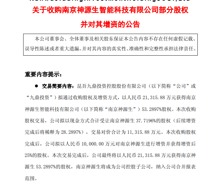 當(dāng)天晚間,九鼎投資披露重磅公告,公司擬通過收購股權(quán)及增資方式,以人民幣2.13億元獲得南京神源生智能科技有限公司(以下簡稱“南京神源生”)53.2897%股權(quán)。南京神源生將成為公司控股子公司,納入公司合并報(bào)表。