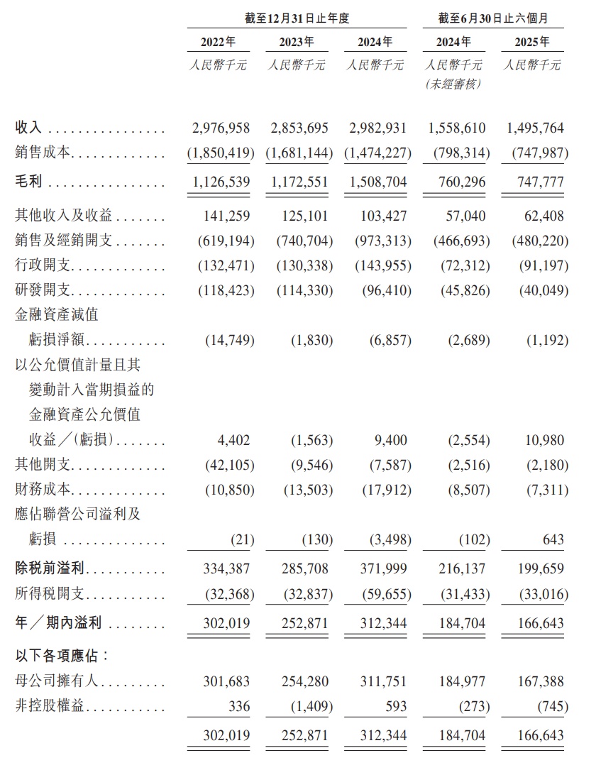 財(cái)務(wù)方面,于2022年度、2023年度、2024年度及2025年截至6月30日止6個(gè)月,可孚醫(yī)療實(shí)現(xiàn)收入分別約為29.77億元、28.54億元、29.83億元、14.96億元人民幣;同期,年內(nèi)利潤(rùn)分別為3.02億元、2.53億元、3.12億元、1.67億元人民幣。