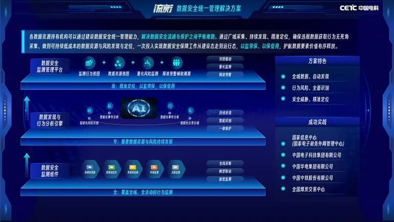 此外,面對數(shù)據(jù)在時空變化下的防護難題,電科網(wǎng)安“流衡”數(shù)據(jù)安全統(tǒng)一管理解決方案以“精準定位、以監(jiān)促防、以防促用”為核心理念,為企業(yè)構(gòu)建分層協(xié)同的數(shù)據(jù)安全治理體系。