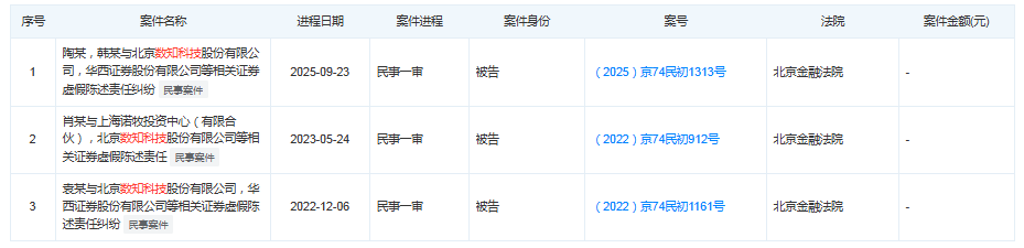 日前,據(jù)天眼查APP,華西證券(002926)新增一條司法案件,華西證券因數(shù)知科技證券虛假陳述一案,被投資者訴至法庭。9月23日,北京金融法院開庭審理了投資者訴數(shù)知科技及華西證券等機構(gòu)的證券虛假陳述責(zé)任糾紛案。
