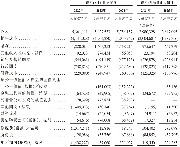 業(yè)績(jī)方面,2022年、2023年、2024年及2025年截至6月30日止六個(gè)月,該公司實(shí)現(xiàn)收入分別約為53.61億元、59.28億元、57.54億元、26.47億元人民幣;同期,年/期內(nèi)溢利約為-14.38億元、4.57億元、3.51億元、2.29億元人民幣。